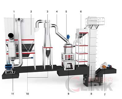 HGM超细磨粉机全套配置包括破碎机、斗式提升机、储料仓、振动给料机、磨粉设备主机、变频分级机、双联旋风集粉器、脉冲除尘系统、高压风机、空气压缩机、电器控制系统。